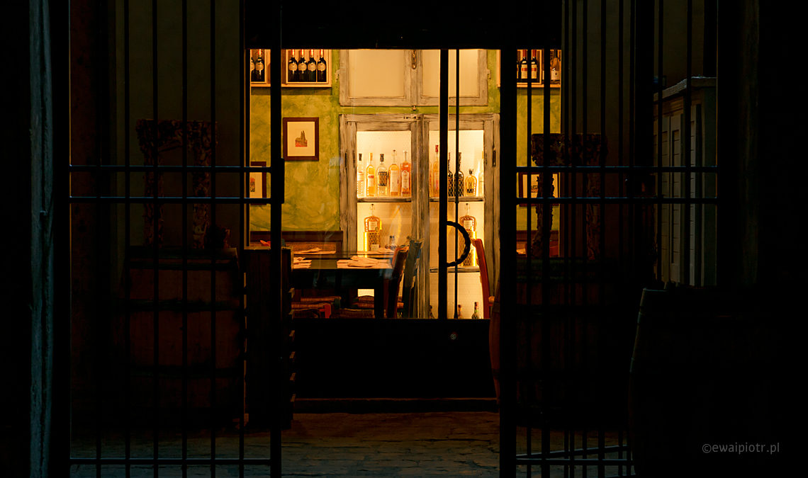 Fotografia na górze to właśnie przykład takiej sceny: widok przez kraty na restaurację. Witryna na środku jest oblana ciepłym, ale nie pomarańczowym, sztucznym światłem. Butelki wina są wyraźnie widoczne, bo najlepiej oświetlone w całej scenie. Jednak sam jasny środek tego zdjęcia nie byłby ciekawy. Interesująco robi się w połączeniu z mrocznymi bokami. Mrocznymi podwójnie, bo raz, że ciemno, a dwa – kraty dodają mroczności same w sobie. Warto zwrócić uwagę na odblaski na nich: niebieskie na krawędziach poziomych i pomarańczowe na pionowych. Do tego drewniane meble, subtelny zarys beczek po prawej stronie, kamienny bruk w błękitnym świetle wieczoru i już mamy smakowitą antycypację kolacji we włoskim miasteczku.